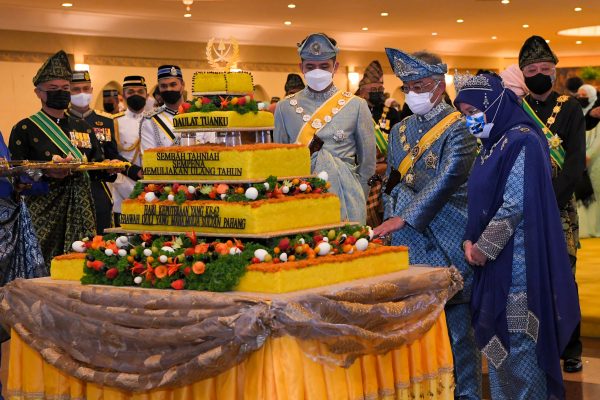 彭亨州苏丹阿都拉陛下(中)主持切黄糯米糕仪式,并由苏丹后东姑阿兹莎阿米娜(右)和彭亨州摄政王东姑哈山纳依布拉欣殿下陪同。(马新社照片)