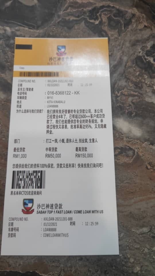 该张罚单无论是颜色和字体都与亚庇市政厅的交通罚单极为相近,但内容是贷款公司的宣传内容,还有英文及中文2个不同的版本。