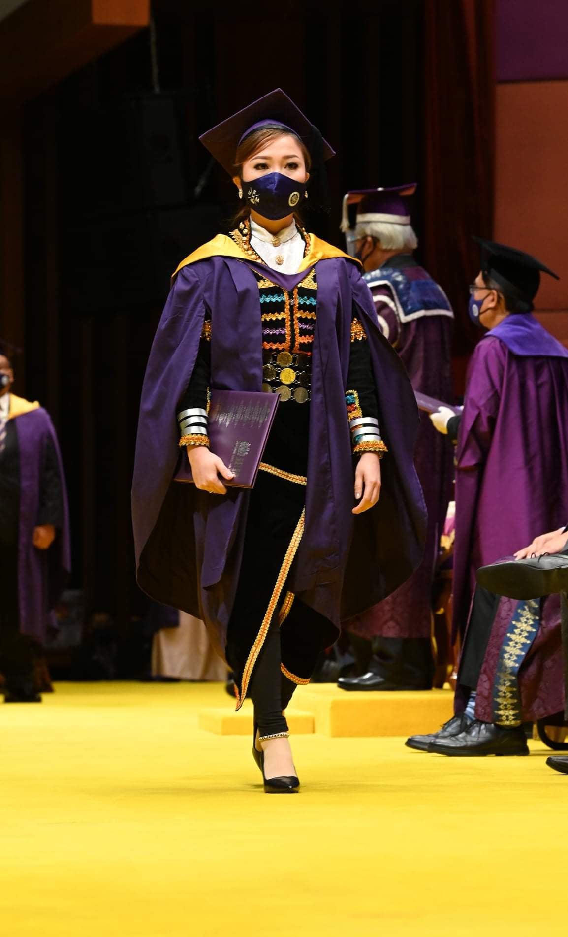 (亚庇16日讯)来自沙巴的嘉达山女孩米雪儿(Michelle Glory),穿上结合吧巴和兵南邦县嘉裔传统服装,披上毕业袍上台领取硕士学位,成为大马理科大学本届毕业典礼上,最亮眼的其中一名毕业生。