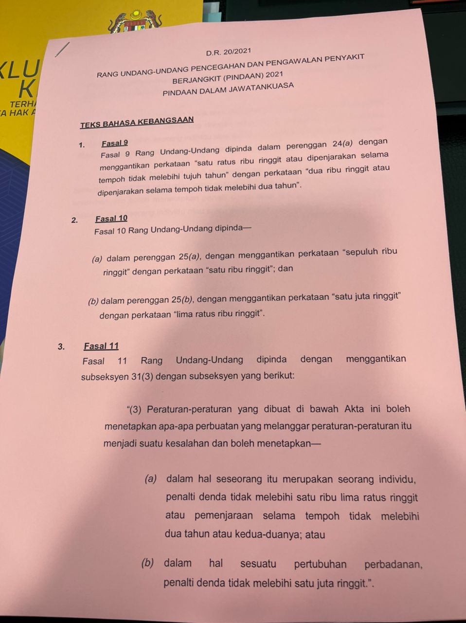 昨日,国会议员们收到修正版的2021年传染病预防和控制法令(342法令)修正法案内容,个人最高罚款额调低至5万令吉,企业则是50万令吉。