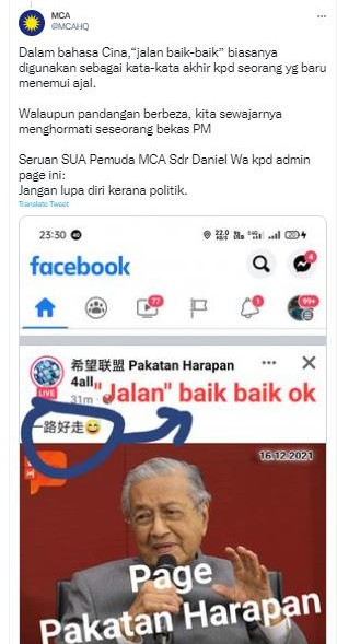 胡伟豪今日透过马华官方推特以马来文写道:“中文‘一路好走’通常是给临终者的最后一句话,虽然意见不同,但是我们应该要尊重身为前首相的敦马。”