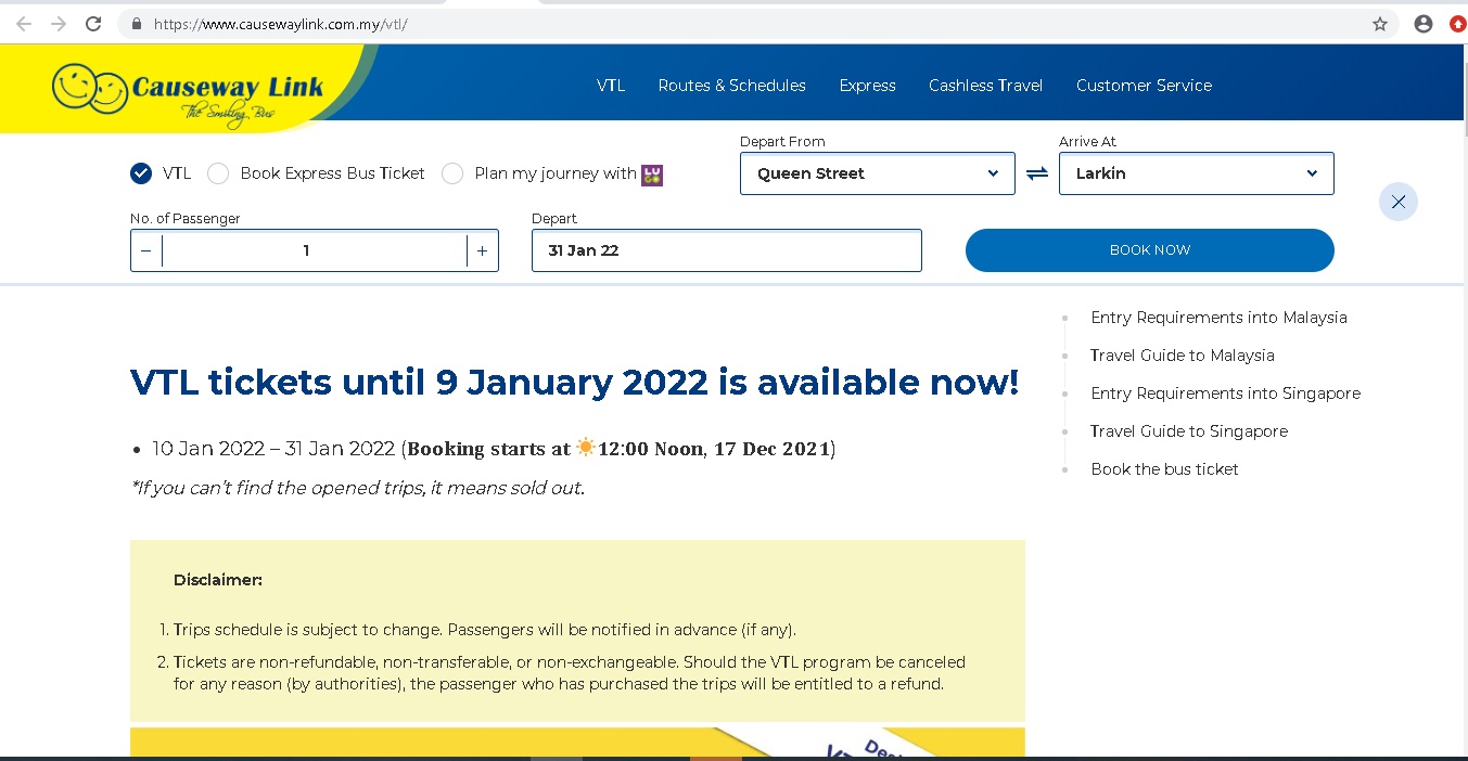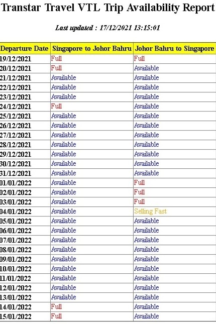 另外,根据星运旅游巴士公司VTL订票网站的查看结果,1月14日至15日从新加坡回返新山的车票早已售罄,而该公司目前只在网上销售12月19日至1月15日的VTL巴士车票。