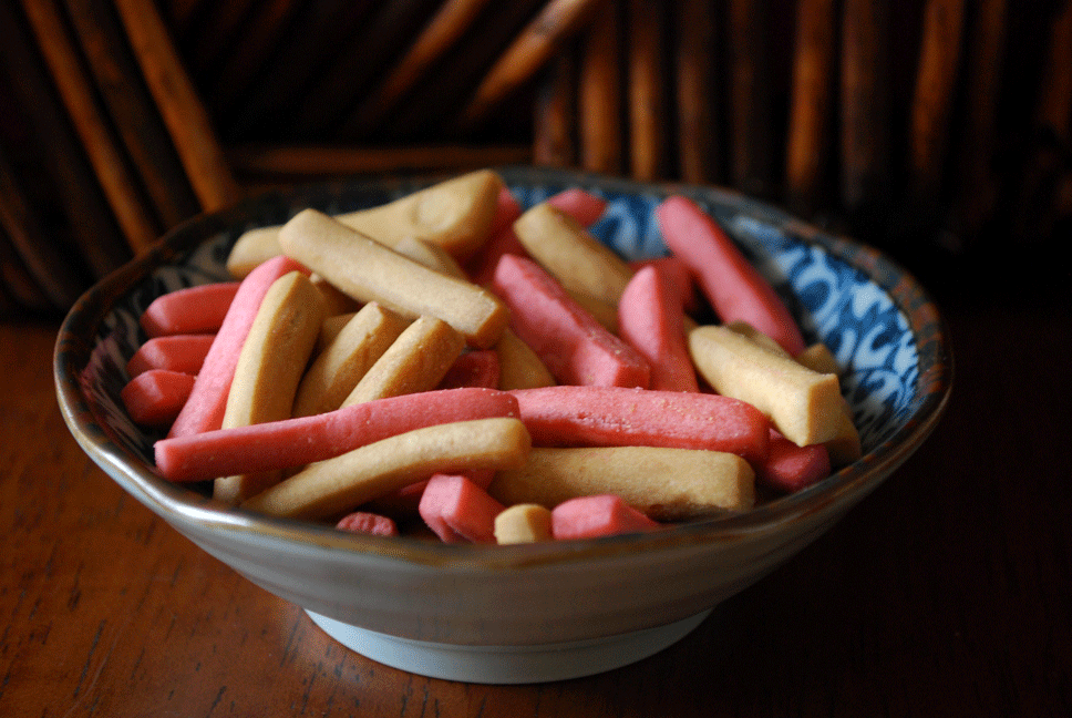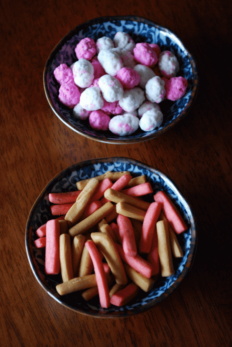 先说“天公豆”,正确的叫法应该称为生仁、生仁糖或生仁豆。传统制法是以炒香的花生米(生仁)置入竹筛,渐次淋上滚烫的糖浆,再手抓竹筛以慢速度不断旋迴滚动,使得花生米都裹上一层层的糖霜为止。外观呈不规则凹凸的小球状,分红白双色,用来祭祀或招待亲朋好友,是福建原乡地区一道流传已久的节庆零食。