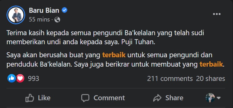 他在正式成绩出炉50分钟前,率先在脸书上宣布胜选,并承诺会为峇加拉兰选区的选民尽心服务。