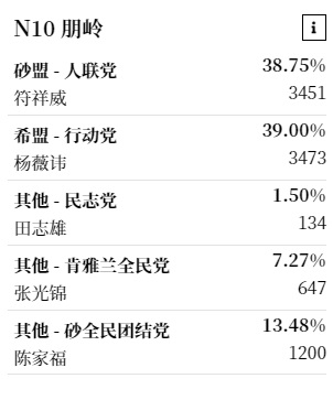 行动党目前领先的另一个选区是由女将出征,即朋岭选区。行动党朋岭区候选人杨薇讳以3473票小幅度领先,对手砂盟人联党候选人符祥威得票3451张,随时可能超越她。