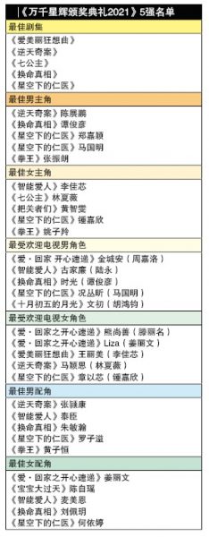 (香港21日讯)无线20日揭晓《万千星辉颁奖典礼2021》16个奖项最后5强名单,视帝大热张振朗顺利凭着《拳王》入围,最大对手是同样没得过视帝的《换命真相》谭俊彦及《逆天奇案》陈展鹏;而锺嘉欣凭《星空下的仁医》获4项提名;胡鸿钧与姜丽文同样有3项提名。至于郑嘉颖、马国明、李佳芯、林夏薇与谭俊彦各有2项提名入围5强。
