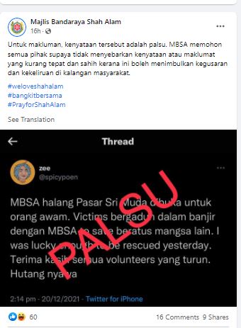 该内容不实的推文于昨日下午2时14分,由用户“@spicypoen”发布,以马来文和英文写道,“沙亚南市政厅阻止沙亚南太子园巴刹向公众开放。灾民与沙亚南市政厅官员在水灾中争吵,以便救出上百名其他灾民。”