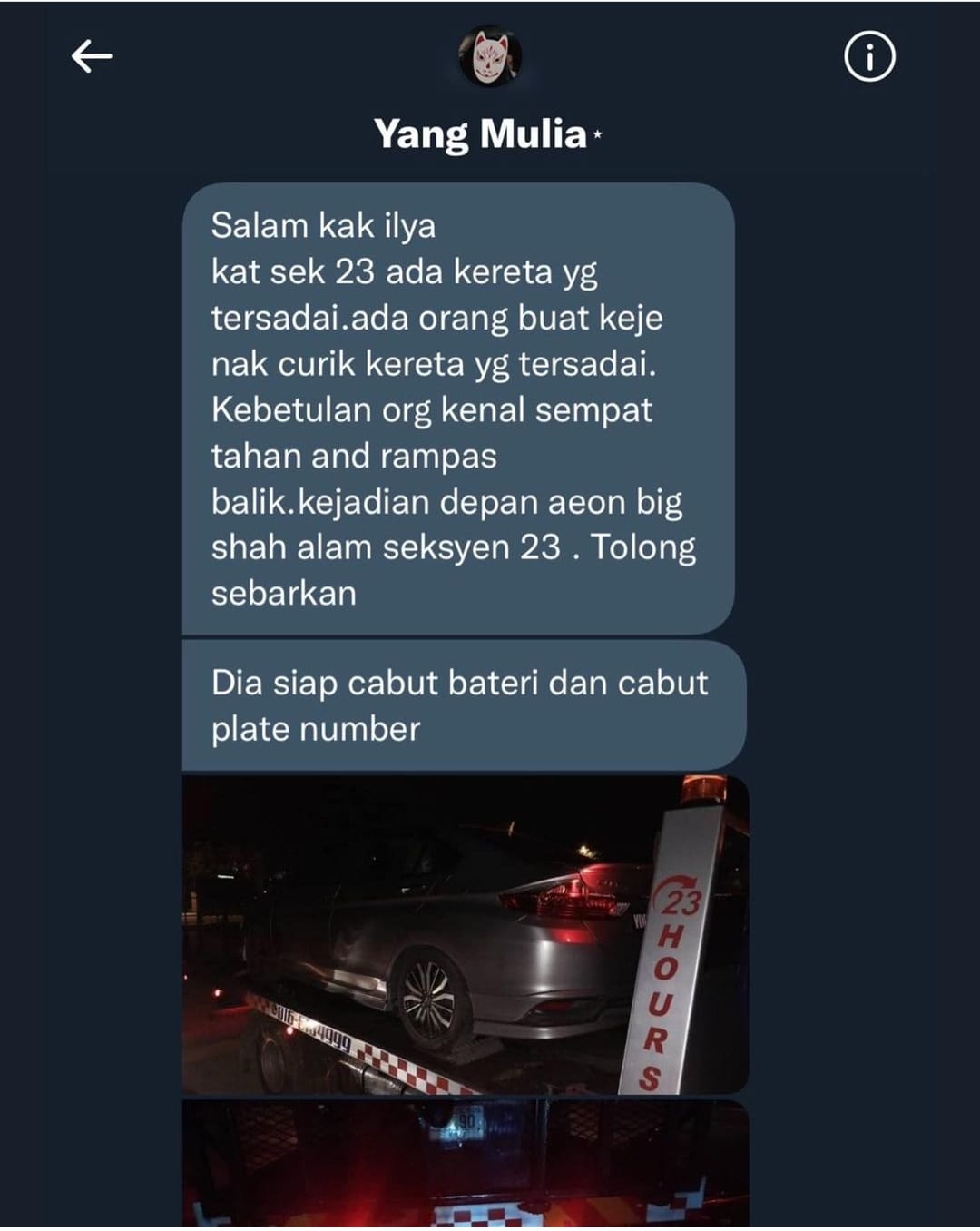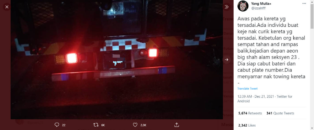 有网民于今日凌晨在社交媒体发帖通报目睹一辆罗里在沙亚南23区一间霸级市场前,企图拖走搁置在路边车輛的讯息,并表示偷车贼已将被偷车辆的车牌和电池拆下,所幸被目睹的民众及时制止。