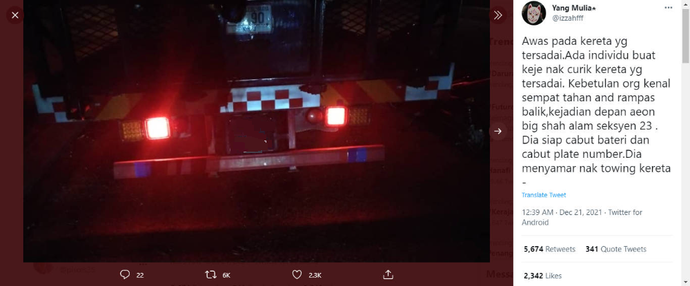 有网民于今日凌晨在社交媒体发帖通报目睹一宗罗里在沙亚南23区一间霸级市场前企图拖走搁置在路边车的讯息,并表示“偷车贼”已将被偷车辆的车牌和电池拆下,所幸被目睹的民众及时制止。