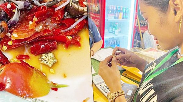 (泰国·曼谷22日讯)社交网络近日广泛流传一名女子拾金不昧的诚实行为,泰国武里喃府直辖县火车市场一家泰式沙拉店的常客努娅帕(25岁),她到店里点了一份腌蟹沙拉回家准备食用时,却发现沙拉里藏有一块金饰小配件,她怀疑很可能是沙拉店主薇贴妮的,因此立即拿去归还。