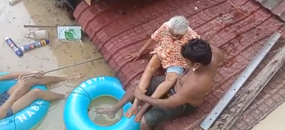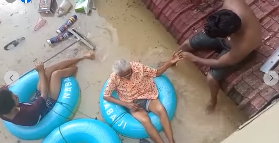 沙亚南太子园水灾来袭淹没排屋一楼,老婆婆与家人受困在二楼,其女婿古纳斯兰不忍心老人家继续受困,把3个救生圈绑在一起,在水中划着扫把,救出亲人。
