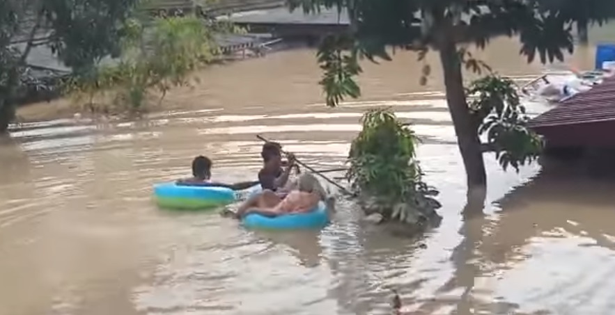 水灾灾民丽拉于19日在脸书分享亲人受困的视频,在二楼阳台外只见老婆婆在儿子的帮助下战战兢兢地坐在救生圈上,由坐在救生圈上的女婿划着扫把拖着她和儿子前往安全的地方。