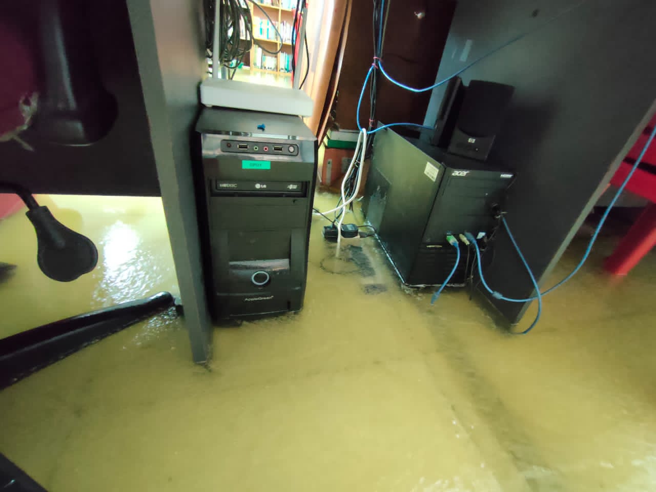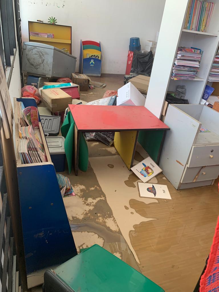 她说,教务处一片凌乱和狼藉,有5台电脑和复印机,还有各类器具和配备都毁坏,图书馆也完全泡水。