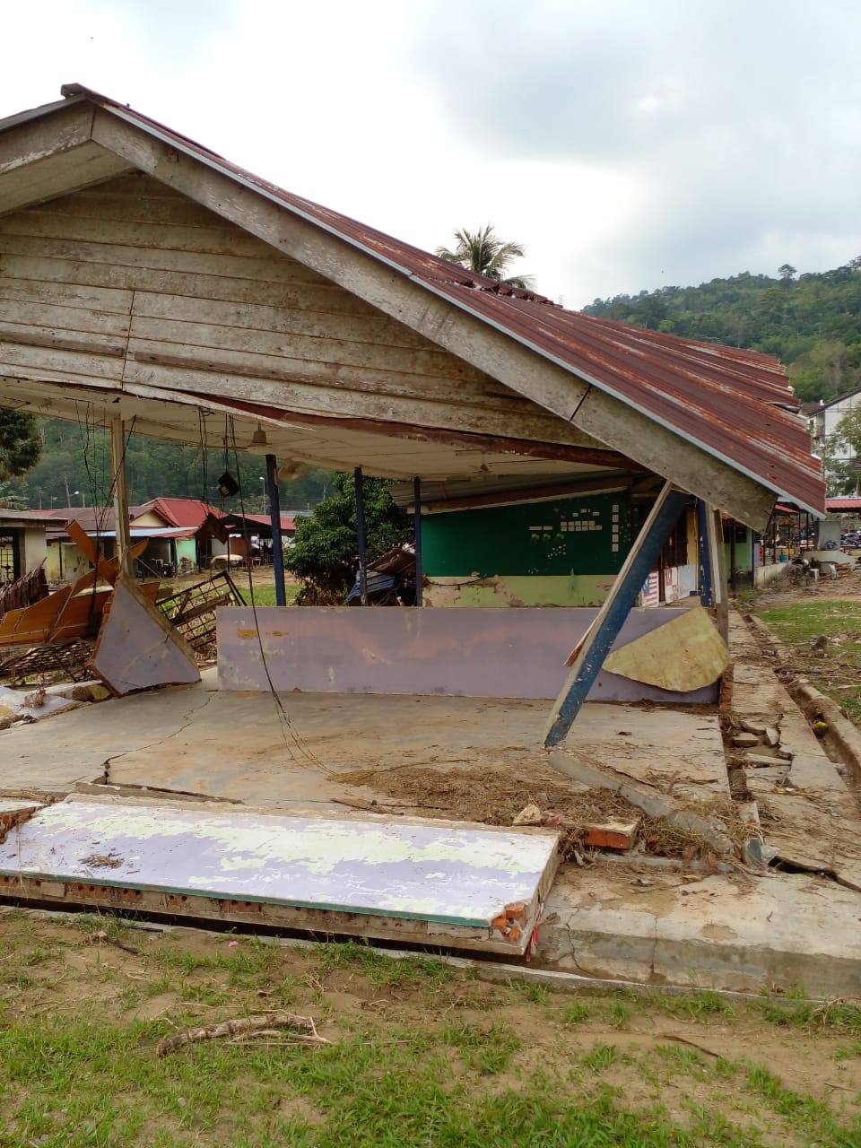 呀吃十八哩中华华小校长陈淑慧指出,靠近冷岳河的食堂和各类储藏室,连同篱笆完全被大水冲毁,只剩下柱子和屋顶。