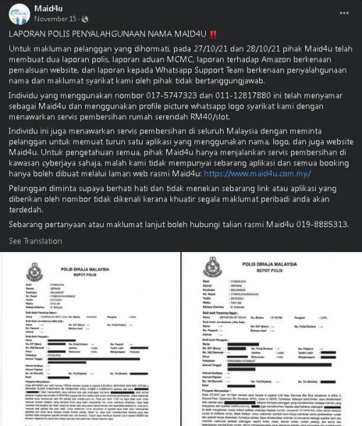 另一方面,女佣公司Maid4U上个月也在官方脸书(https://www.facebook.com/story.php?story_fbid=544800453500900&id=100039128517291)提醒公众,有不法集团盗取他们公司的名字及标志,架设假网站进行诈骗,该公司已分别在10月27日及28日,向警方和多媒体及通讯委员会投报。