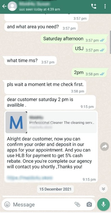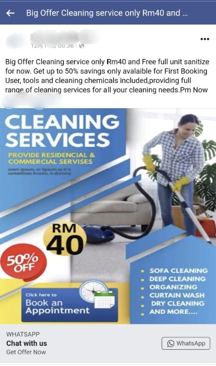 “当时对方声称他们的清洁服务涵盖了雪隆、森州、马六甲、怡保、槟城、柔佛、吉兰丹、霹雳、吉打及登嘉楼等地,并在简单查询后给了我一个链接,要我点击链接到其网站确定预约及缴付定金。”