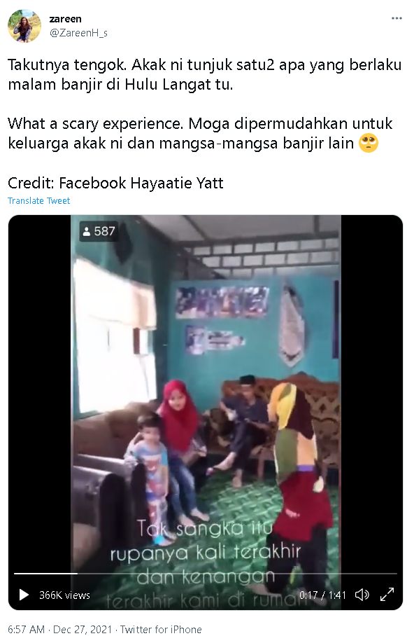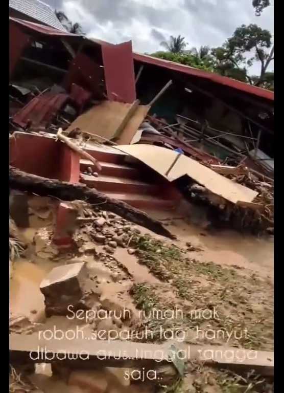 (八打灵再也28日讯)马来西亚前锋报记者扎琳于推特上转发网民哈亚蒂的视频,展示其位于乌鲁冷岳,已故母亲老家发生水灾的经过和恐怖经历。