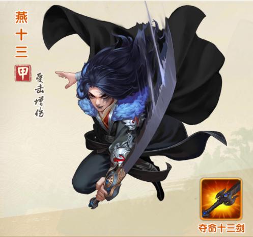 夺命十三剑是燕十三赖以成名的十三招家传剑法,可是他杀人从来无需用满十三招,通常都是一招了账的。死于这套剑法下的剑客,据燕十三在《三少爷的剑》第五章“狮子开口”中所说的,一共有63位。引述《三少爷的剑》第一章“一剑穿心”的原文如下,是他一出场的动手场面: