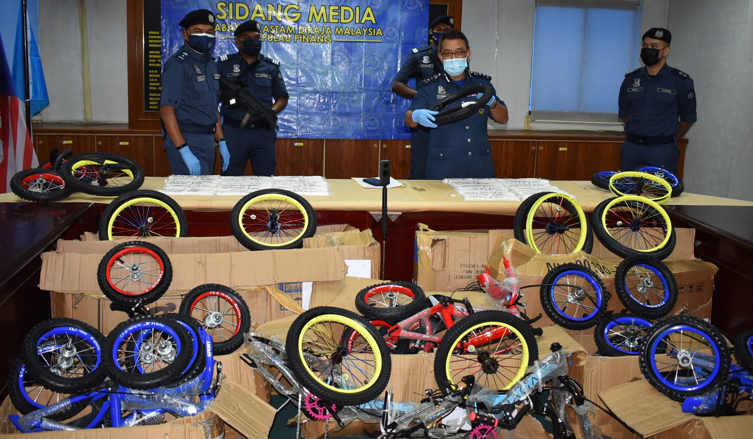 他说,其中一个包裹内装有儿童脚车及配备,而执法员从轮胎骨架发现毒品,随后执法员将涉及的10个包裹扣返位于北海峇眼惹玛关税村的毒品罪案调查组办事处进行深入调查,并发现104包相信是甲基安非他命的毒品。