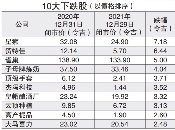 (吉隆坡30日讯)疫情起伏不定,国内经济前景始终潜存隐忧,被视为经济复苏后率先出线的消费股,在2021年整体表现惨淡,10大下跌股有半数是消费股,至于去年“疫”军突起的手套股今年由盛转衰在股海浮沉,也是另一伤亡惨重的类股。