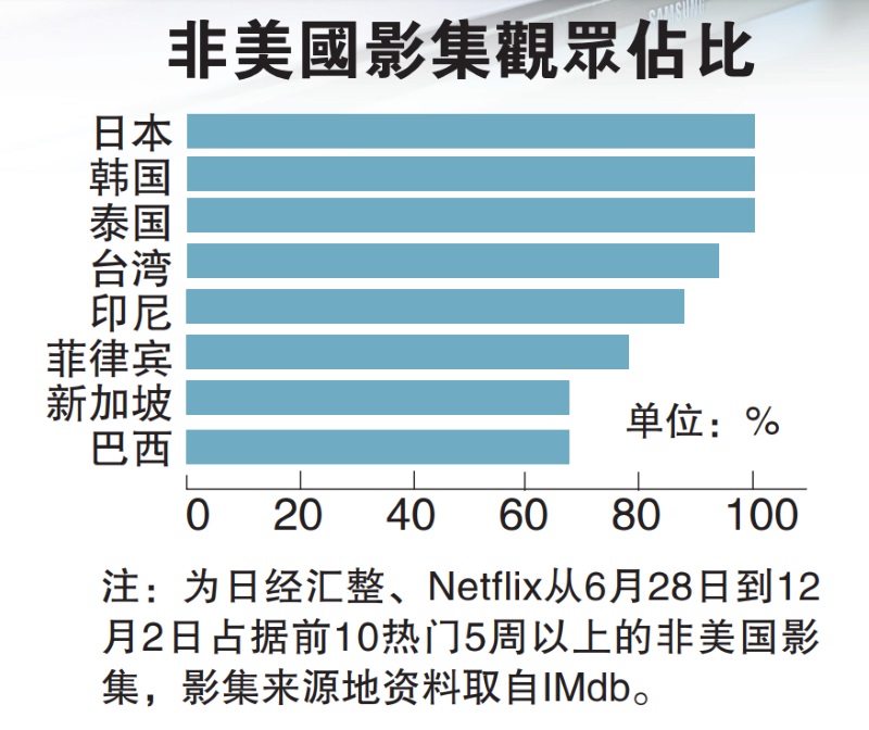 在此之前,内容供应商都还在强力宣传好莱坞强片,但网飞(Netflix)的收视数据凸显亚洲观众偏好本土口味的趋势。日经分析Netflix从6月28日到12月12日的数据发现,在美国市场,除了鱿鱼游戏,受欢迎的全都是在本地制作的电视剧或动画节目。