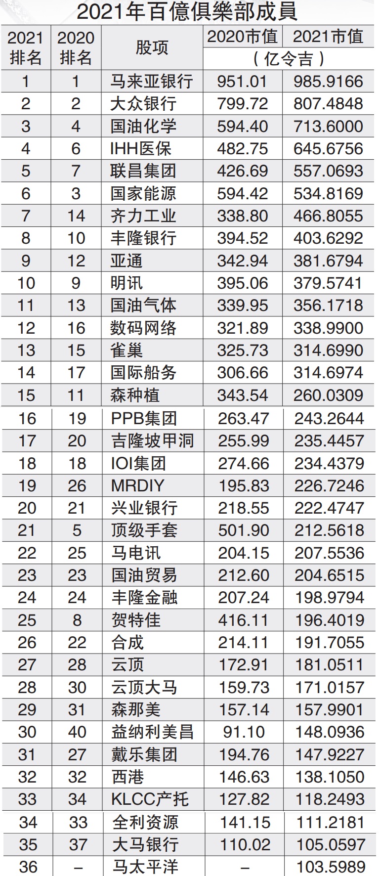 (吉隆坡31日讯)疫情打乱股市走向,投资者频频调整布局应对,紧跟趋势吸纳科技股,同时扫出手套股,马股2021年的市值“百亿俱乐部”成员比去年少1位,另有两位手套股成员出局,迎来科技股成员。