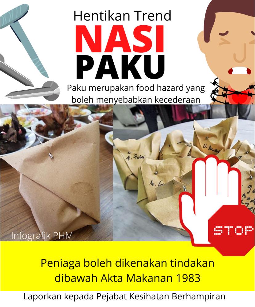 “大马公共卫生”(Public Health Malaysia)在脸书和推特发帖指出,铁钉是食物危害,不适合用作打包食物,同时呼吁商家停止用铁钉来包扎打包食物的潮流,改用橡皮筋或其他方法来包扎打包的食物。