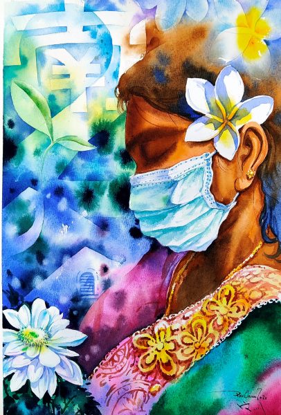 我非常幸运可以在网络遇见小南旅画同学们,有你们的陪伴,人也不会觉得孤单寂寞,虽然留在家里的时间比较长,但一点也不空虚;我们从来没有见过面,但是也不陌生。这次我想用这一副作品跟大家分享,画面里我画的是印度友族妇女,在大时代变化多端的日子里,也要为生活空间里选择一些小花装饰,生活虽然不容易,但是不能随便,戴著口罩也要感觉到花的芬香,这一幅作品的主题命名为:记得微笑。