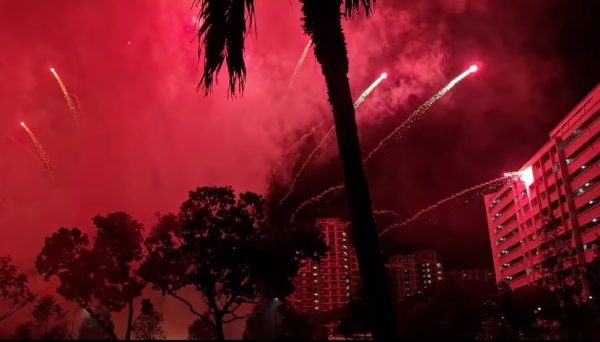 根据他上载到Facebook的视频,绚烂的烟火一个接一个直冲云霄绽放,就在影片的1分38秒那一刻,其中一道烟火竟击中右边组屋最高楼层的一个单位。