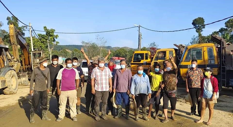 热心人士出动泥机清理新村的树桐,整个环境泥尘滚滚。(取自杜燕丽脸书)