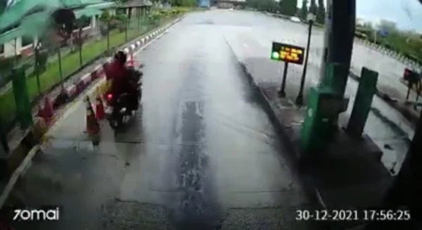 据行车记录视频显示,当时这辆罗里正行驶到收费站的左边车道,在付费后正要开车过去时,突然左侧有辆摩托车急驶而至,直接驶出收费站。