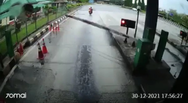 一名罗里司机开着罗里到收费站前,付费后正要过收费站,却被闯入收费站的一辆摩托车抢道,结果他眼睁睁看着栏杆落下,被迫缴付两次过路费。
