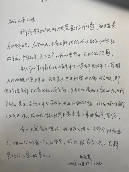 明庭贵心疼这些学生们,希望他们也能吃到新鲜的饭菜,就决定免费给他们做饭,至少让他们每天能吃上一顿现做的饭菜。明庭贵的家人支持他的想法,一家四口都加入了做饭行列,其中包括他怀孕五个多月的妻子。有租客要给钱表达感谢,都被他拒绝了,“一开始给大家做饭就没想收钱,做饭是我的一点心意,希望大家能共渡难关。”(泰国世界日报)