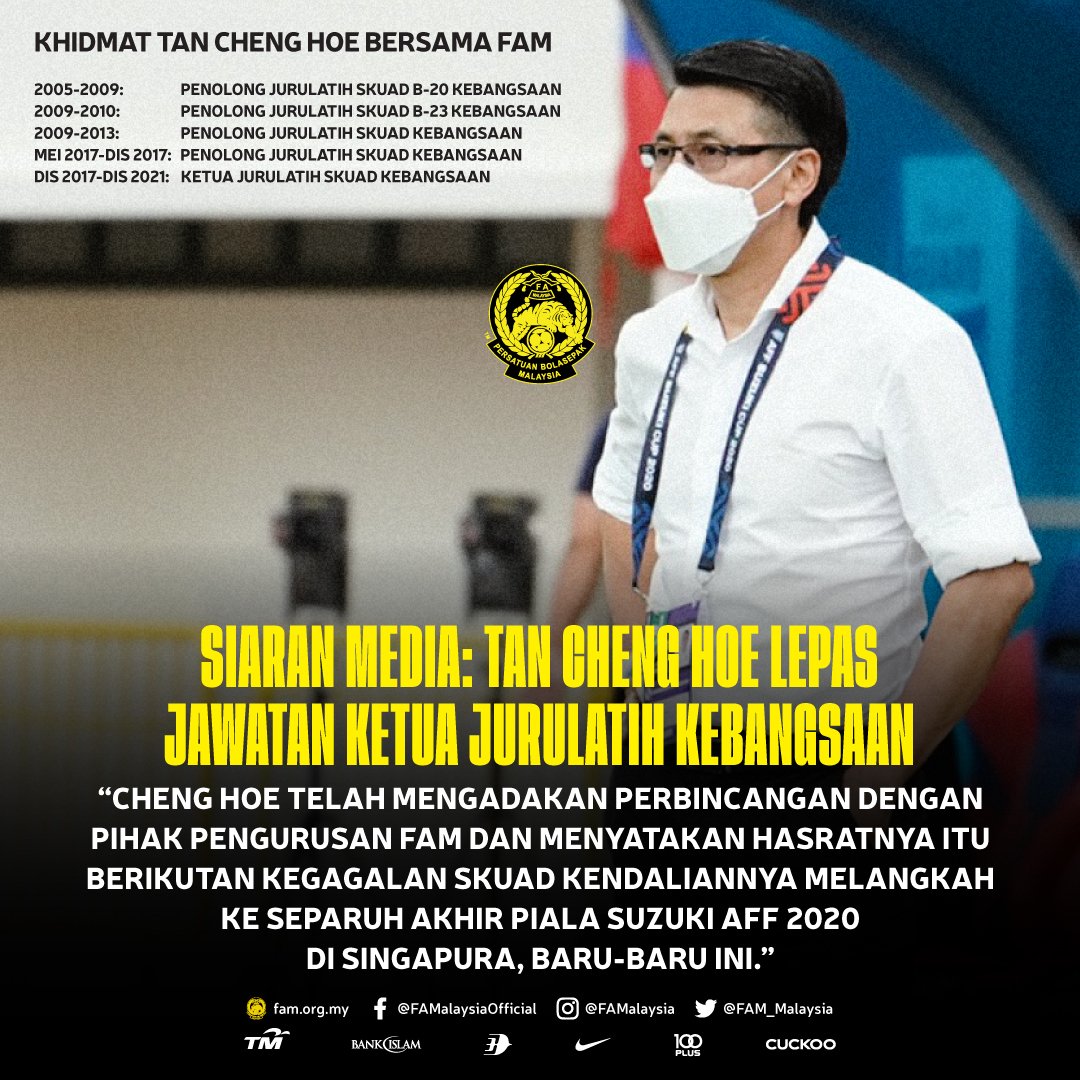 “大马足总经过多方面的讨论之后,最终双方达致协议,足总尊重陈清和的决定,接受他辞职。陈清和从2005年开始执教20岁以下国青队至今,已经为大马足总服务了14年,足总非常感谢他多年来的付出。”