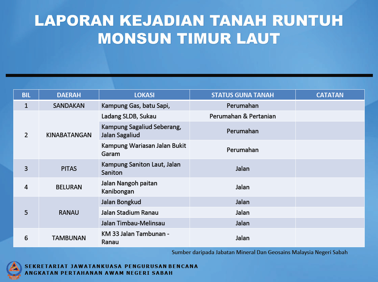 6起道路土崩分别发生在兰瑙(3)、必打士(1)、比鲁兰(1)及担布南(1)。另有4宗土崩发生在甘榜和园坵,全部土崩事件没有造成伤亡。