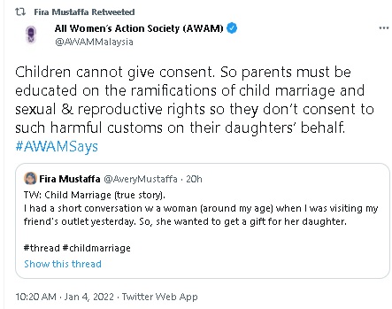 另外,妇女行动协会(AWAM)转发此贴时,也认为父母必须被教育,关于童婚及性和生育的权利,如此就不会代表女儿同意这种有害的习俗。