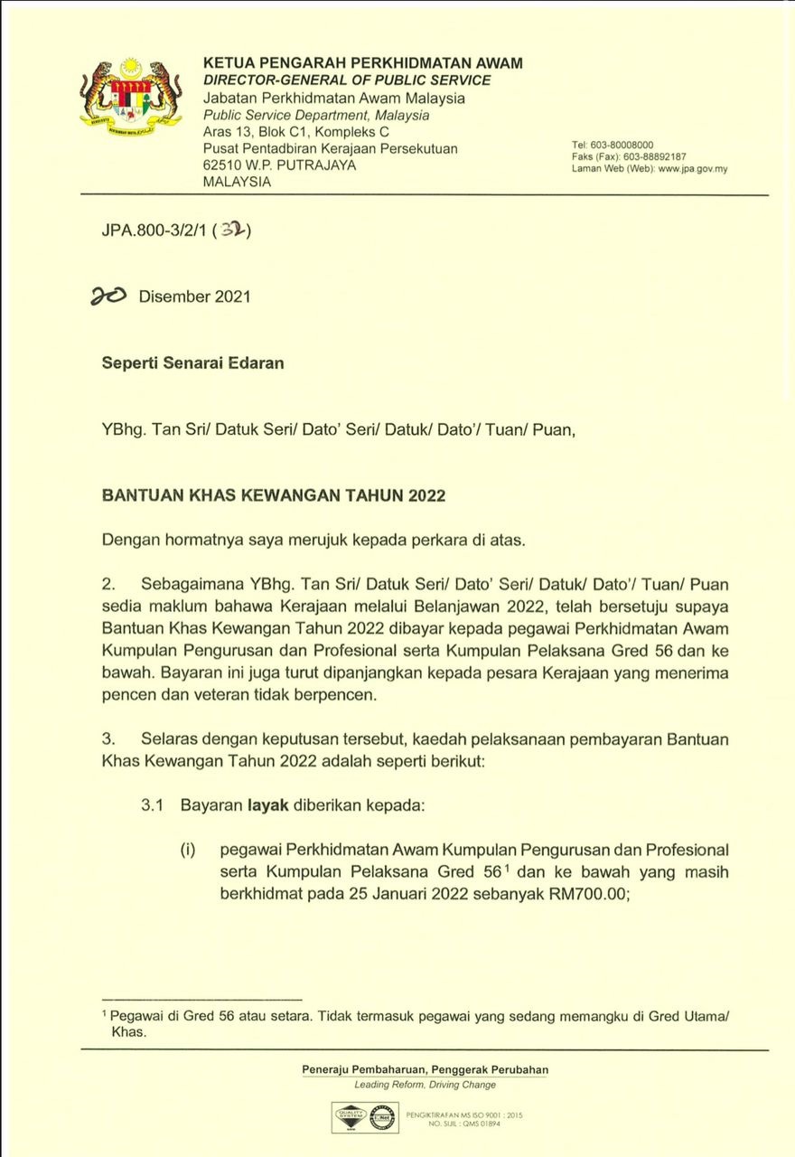 根据星洲日报了解,公共服务局总监丹斯里莫哈末凯鲁阿迪在一封志期2021年12月20日的公函中指出,政府是在2022年财政预算案中宣布56级(Gred 56)及以下和退休的政府公务员,可分别享有700令吉和350令吉的特别援助金。