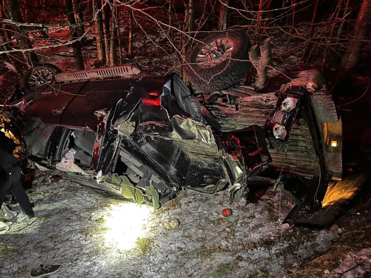 一辆严重受损的皮卡货车看似发生翻车事故,从车内被弹出的两人受了重伤,同时在寒冷的天气下他们的体温也过低。