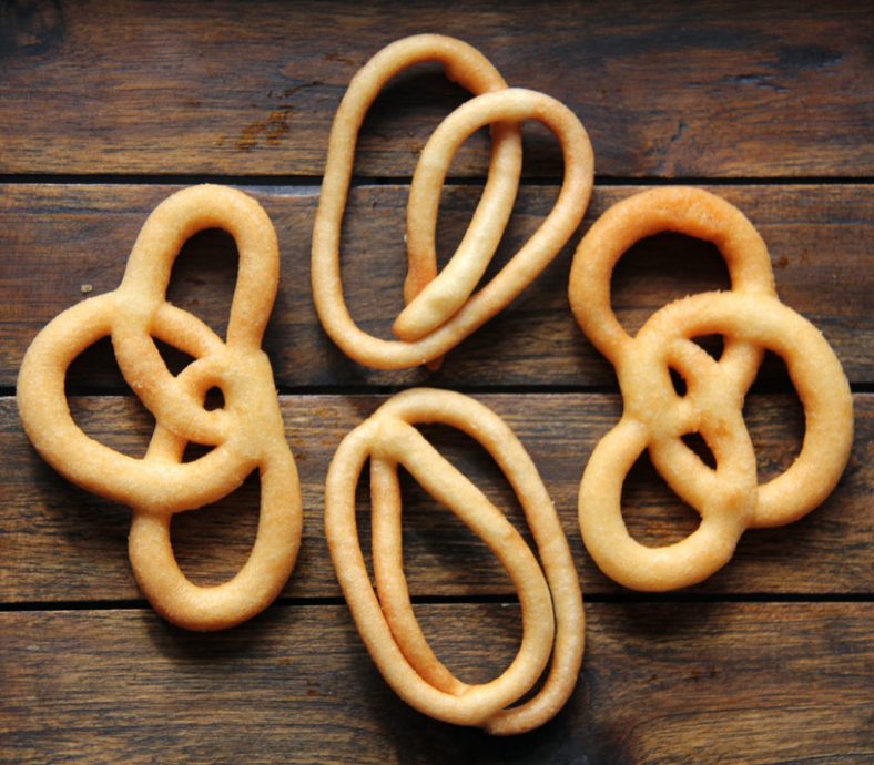 清晨,在文冬巴刹旁的露天菜巷里,见一小妹摆摊卖一包包的油炸零食,乍看就像印度人的Muruku,上前才发现纸板上写着“糖环”两宇。