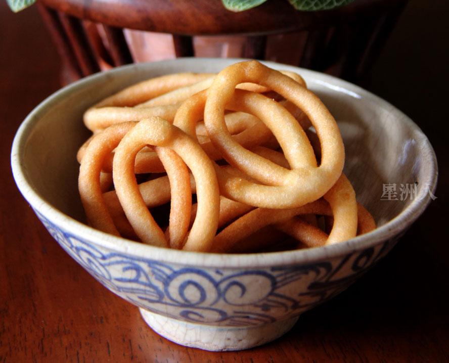 光是名字,已环环扣扣的将许多久远的记忆给“Tangkap”起来,就如当年母亲那不善伪装的恐吓语调:再不乖便叫马打(警察)来Tangkap(捉)你!是的,从意象到转化为动作,“糖环”一词,如果不是从这小妹口中说出,我还真的早已忘了在童年深处曾听祖辈提起过这年食的名字!