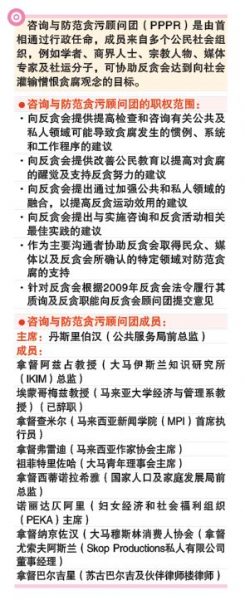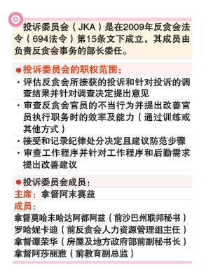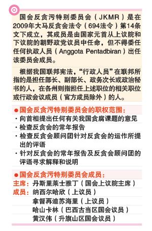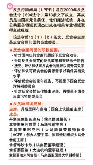 其中,国会反贪污特别委员会、反贪会顾问团和投诉委员会是通过法律规定成立,而咨询与防范贪污顾问团和行动评估小组则是通过行政成立。