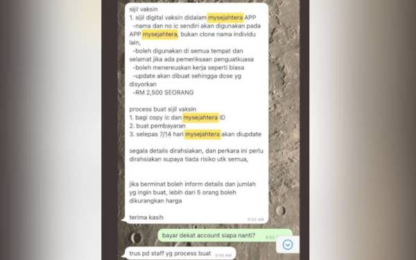 根据《阳光日报》报导,近日WhatsApp疯传一则短讯,卖家称只需支付2500令吉,民众即可买到“安全”的疫苗证书。