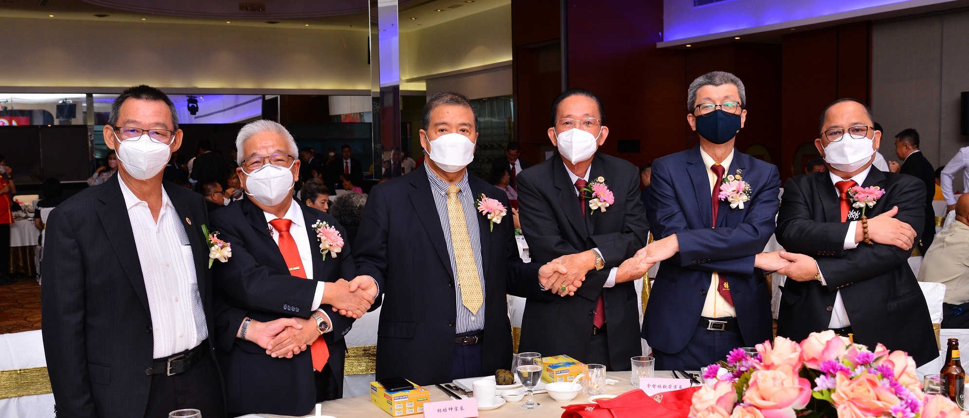 林福山(右二)与林顺平(左三),以行动证明“林氏一家亲”,左一及二为林振华及林培坤、左四为林钦荣、右一为林进利。(陈秋成摄)