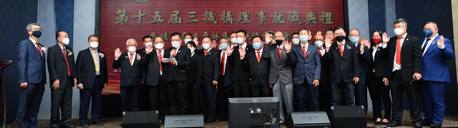巴生滨海林氏宗亲会会长林培坤(左四)率领第15届理事会宣誓就职,由林福山(左起)、林钦荣及林顺平主持监誓。 (陈秋成摄)