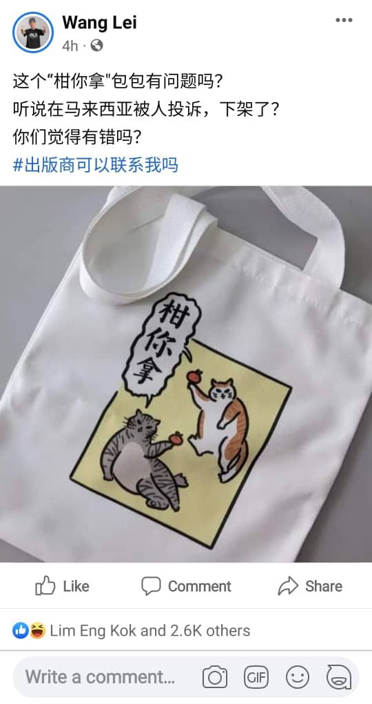 (八打灵再也10日讯)大将出版社因为贩售“柑你拿”帆布包一事饱受争议,包括指帆布包设计“低俗当有趣”,让“卖鱼哥”王雷忍不住问道“这个包有问题吗?”,同时也呼吁出版商可以联系他。