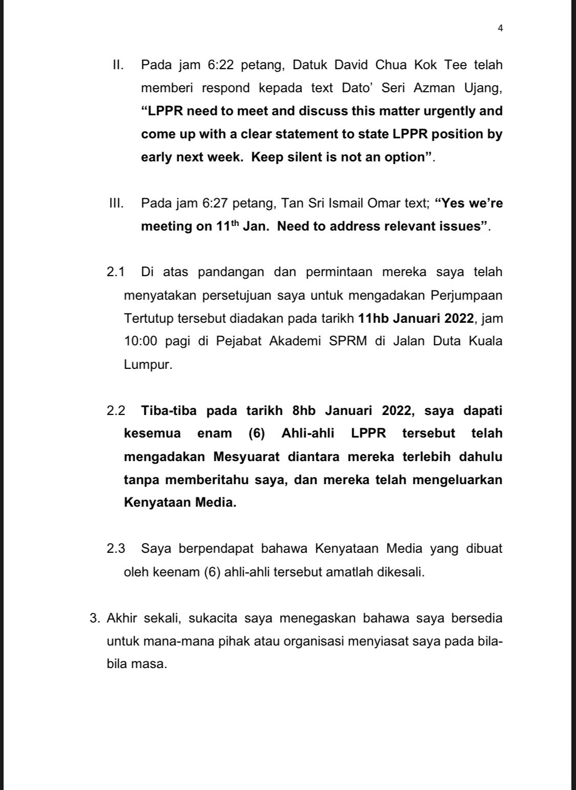 ●根据他们的意见和要求,阿布查哈已表示同意于1月11日上午10时在吉隆坡大使路的反贪会学院办公室,举行闭门会议。