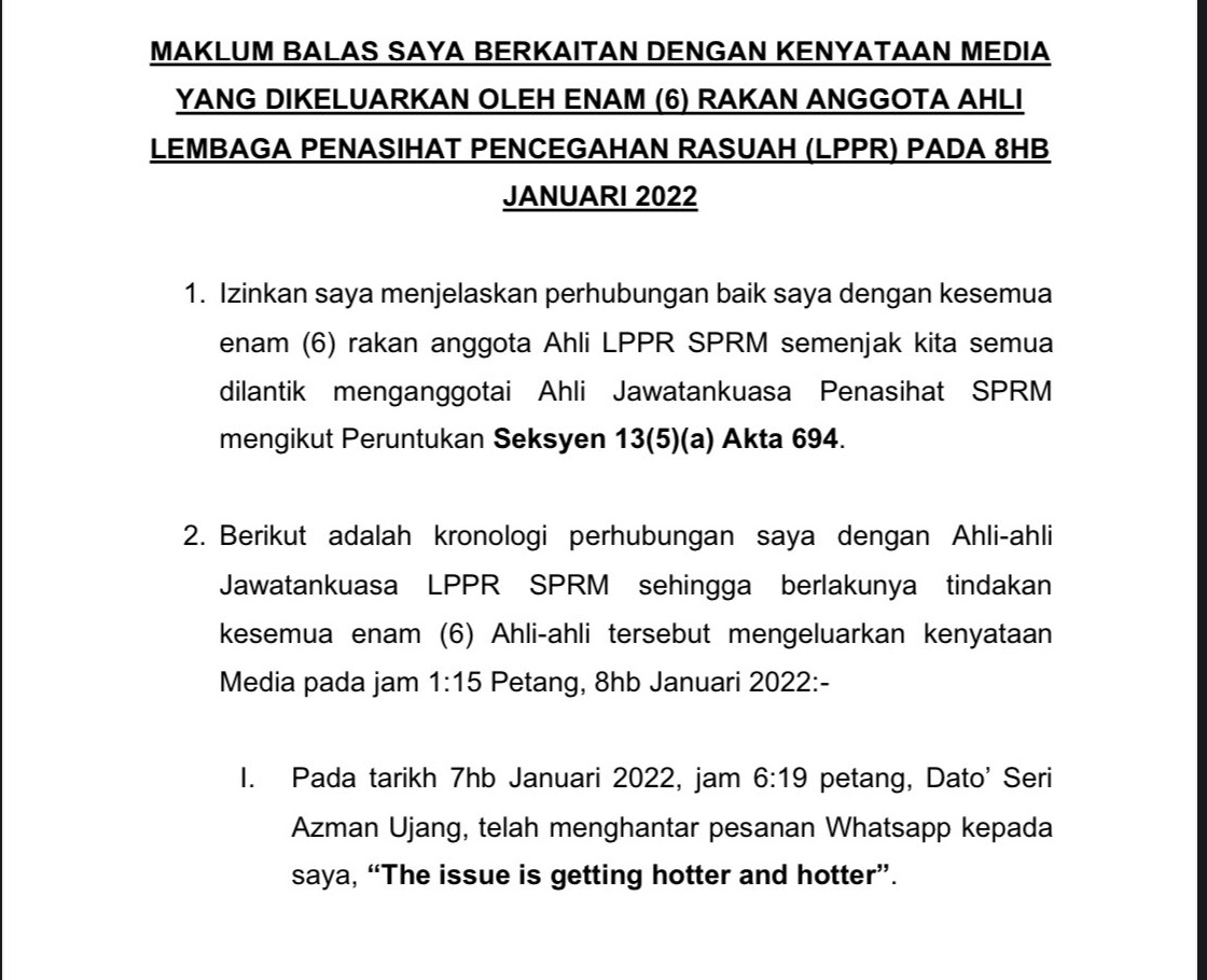 (布城11日讯)反贪会顾问团主席丹斯里阿布查哈公开6名成员与他联系的时间表及WhatsApp短讯内容,表示原本说好与他先开会的6名成员,背着他对媒体发表谈话。