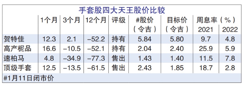艾芬黄氏维持手套股“中和”评级,手套业目前仍在等候重估催化剂,相信在需求正常化与新产能增长,赚幅若今年下半年持稳,将是重估催化剂。