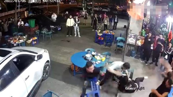 (北京12日讯)中国一对夫妻酒驾开车蹭到路边桌椅,妻子立即下车破口大骂,结果被众人打趴在地,警方已介入调查。