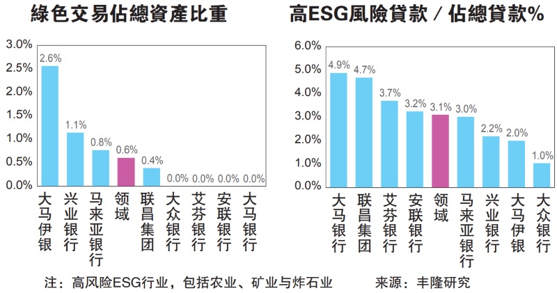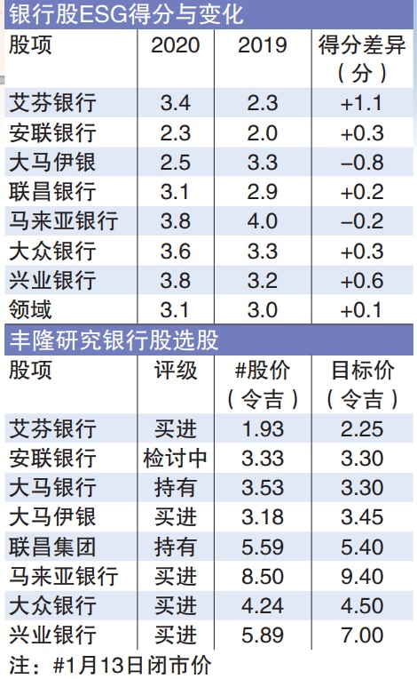 丰隆研究对国内银行的ESG得分进行评估,发现2020年国内5家银行ESG大改进,其中艾芬银行(AFFIN,5185,主板金融服务组)进步最神速(改进1.1分),另4间银行包括安联银行(ABMB,2488,主板金融服务组)(升0.3分)、联昌集团(CIMB,1023,主板金融服务组)(升0.2分)、大众银行(PBBANK,1295,主板金融服务组)(0.3分)与兴业银行(RHBBANK,1066,主板金融服务组)(进步0.6分)。